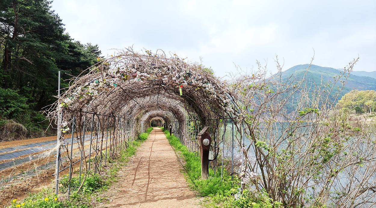 아직은 잎이 피여 나지 않은 덩쿨 터널을 지나간다,
