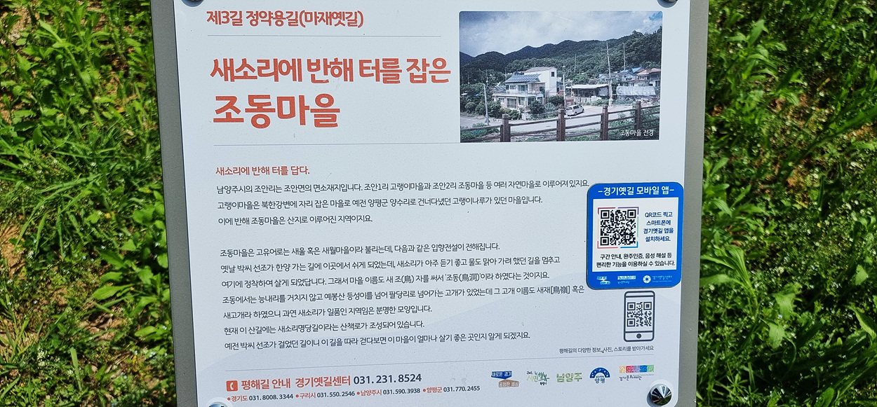 사거리 지나있는 다산길쉼터에는 "새소리에 반해 터를 잡은 조동마을"