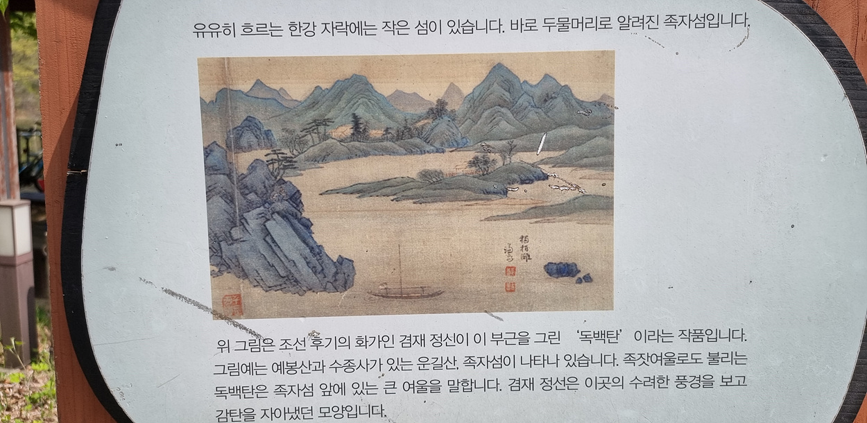 족자섬 안내에는 유유히 흐르는 한강 자락에는 작은 섬이 있습니다,