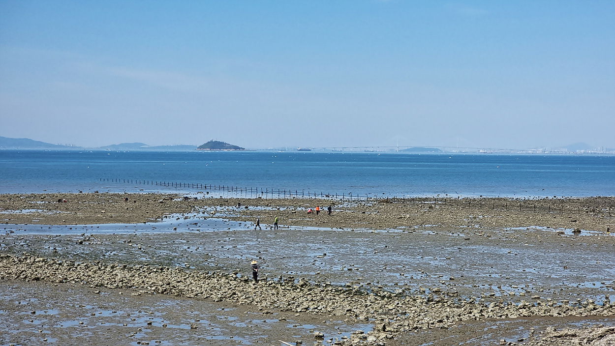 갯벌에서 조개를 캐서 머리에 이고 돌아오는 주민분들도 보인다,