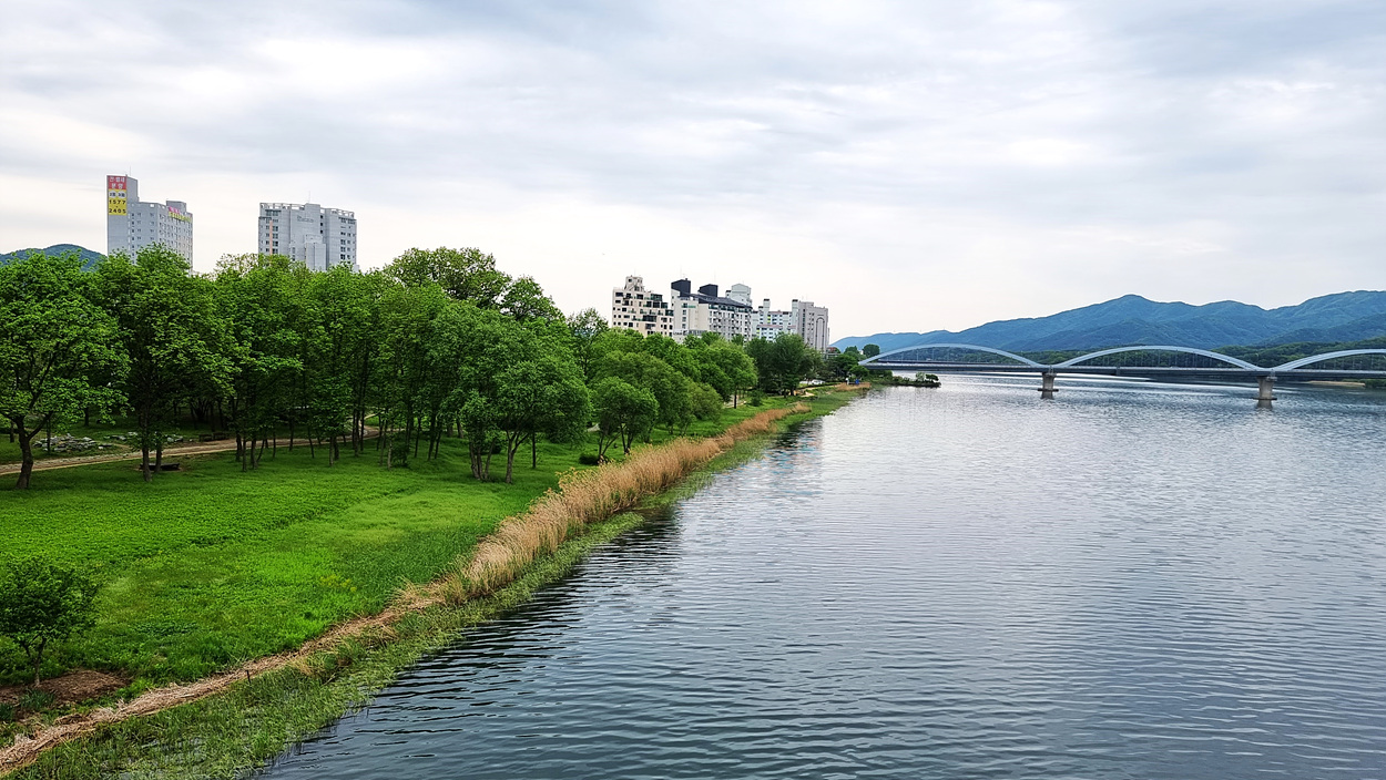 공원녹지대와 북한강, 양수대교와 아파트까지 가 그림처름 어울린다,
