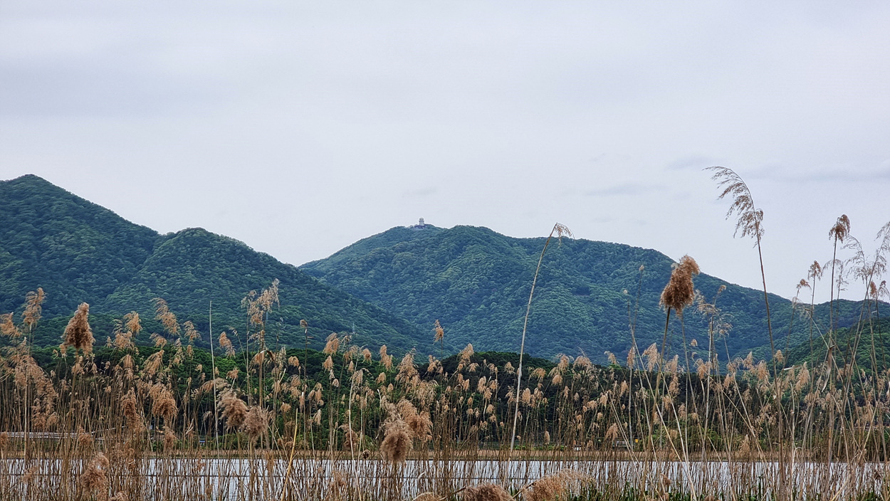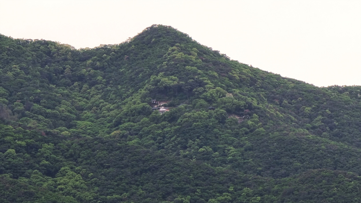 북한강 건너편 우뚝 솟아있는 산 정상에 둥근 구조물이 보인다,