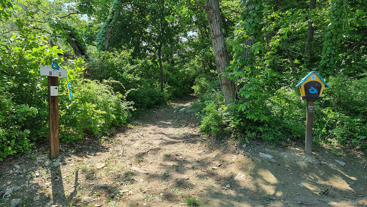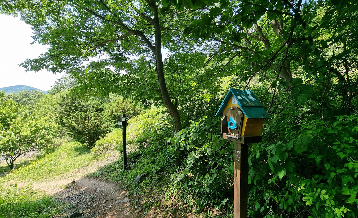 산길로 들어가는 입구에는 물소리길1코스 스템프함도 있다,