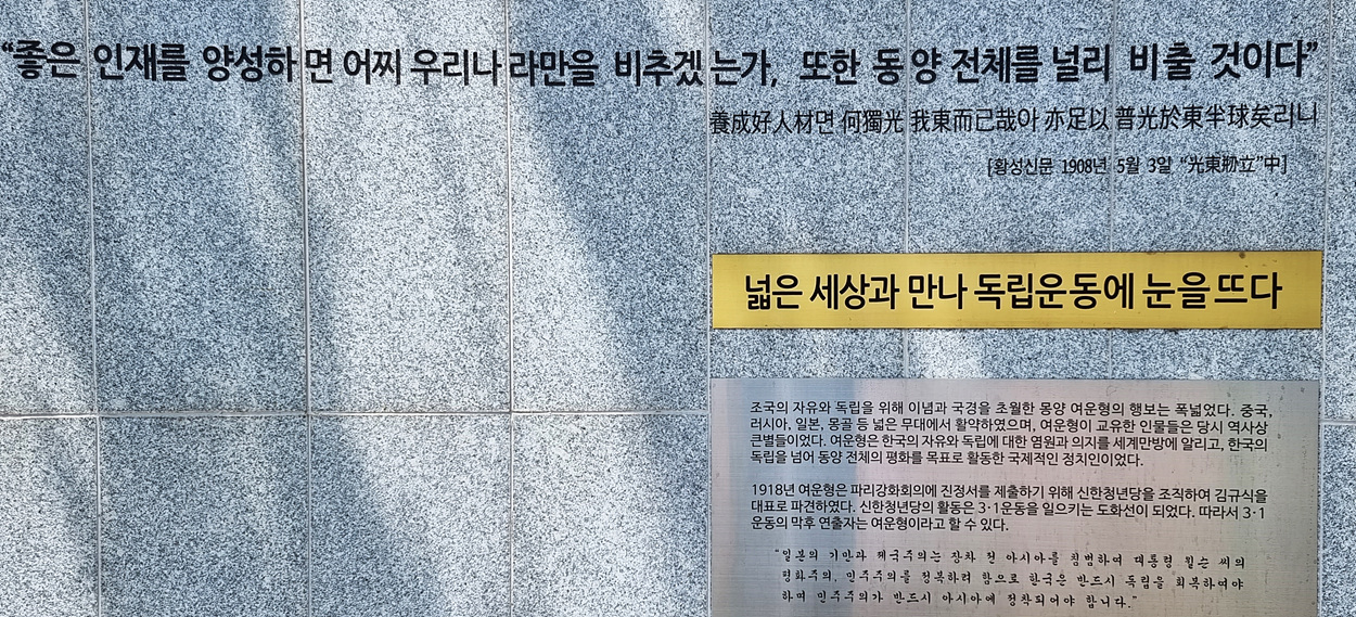 넓은 세상과 만나 독립운동에 눈을뜨다, 라는 글이 새겨져있고