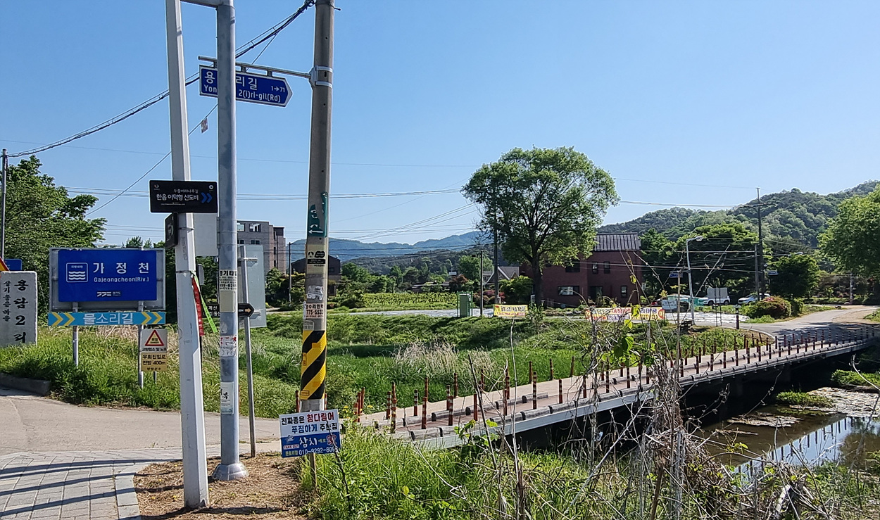 오른쪽으로 개천 다리를 건너 교골길로 들어간다,