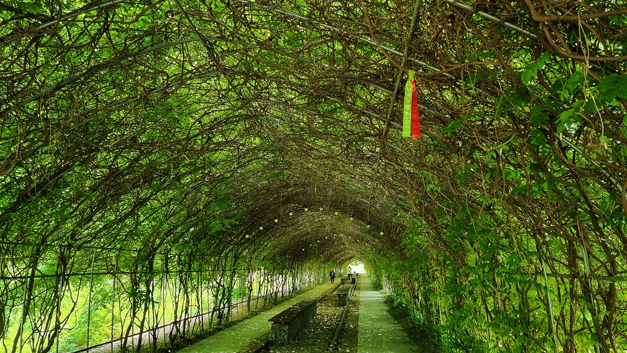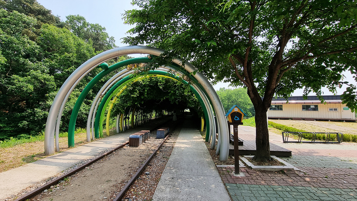 철로 위로 파이프로 아치를 만들어서 등나무를 심었는데