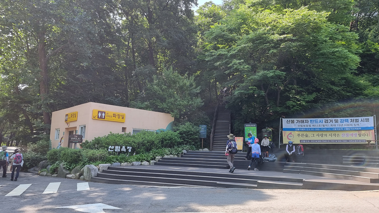 화장실 앞에 산림욕장 이름표가 붙어 있다,