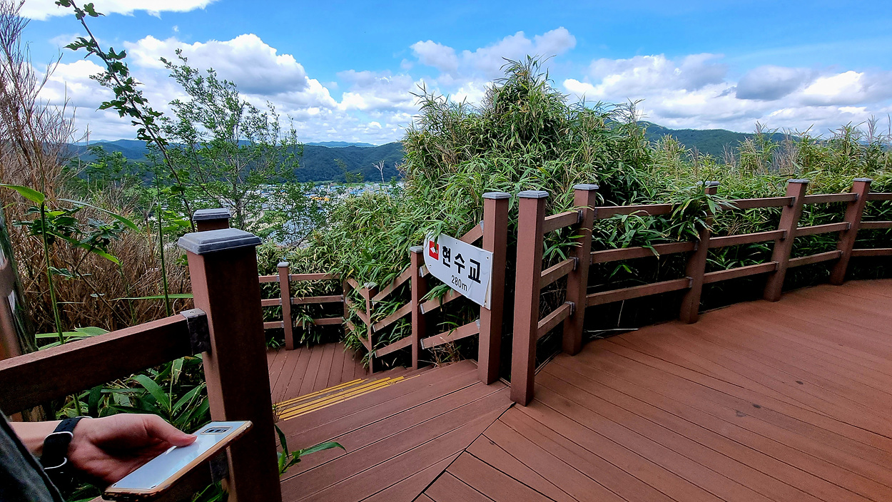 야트막한 산으로 정상까지의 길은 나무데크로 설치되여있다.