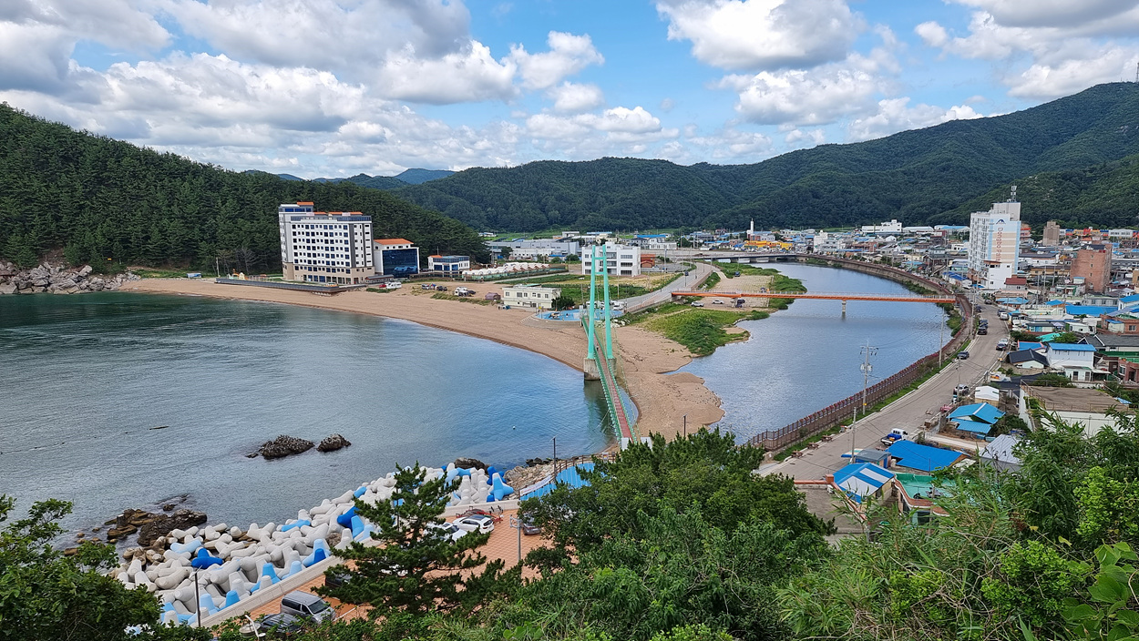등대 전망대로 올라가는 중간에서 내려다 보이는 축산천과 바다,