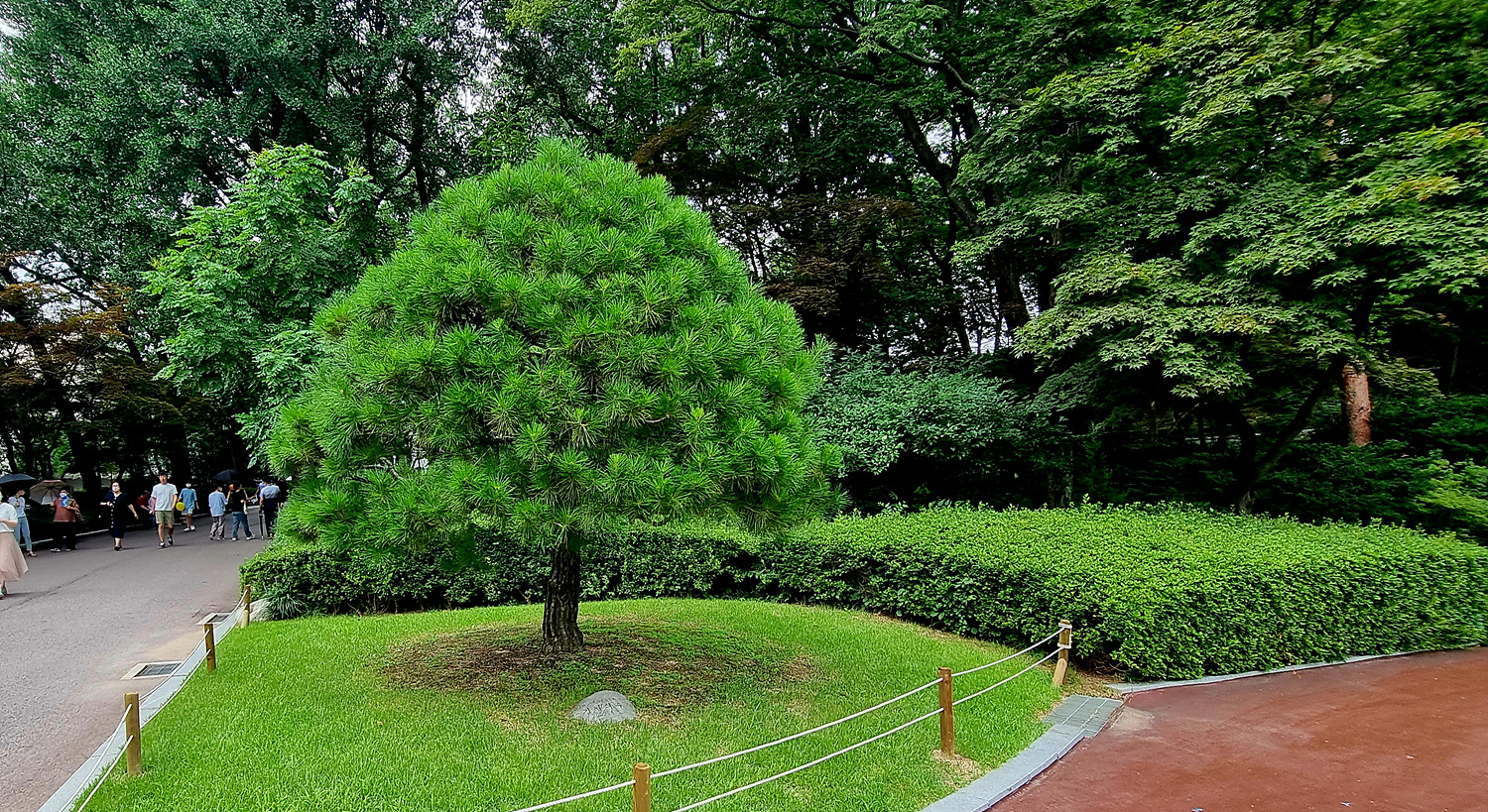 상춘재 녹지원 끝 모퉁이에 기념식수를 한 나무가 있다,