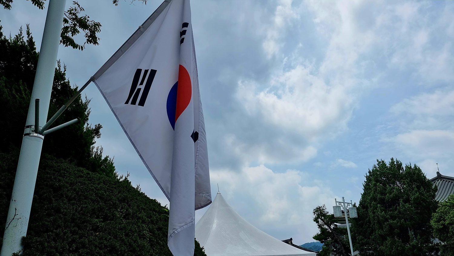 광복절이 내일이니 태극기 계양도 되여 있다,