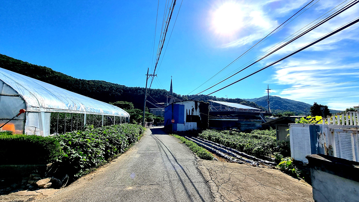 높은 십자가 탑이 있는 교회도 보이는 길로