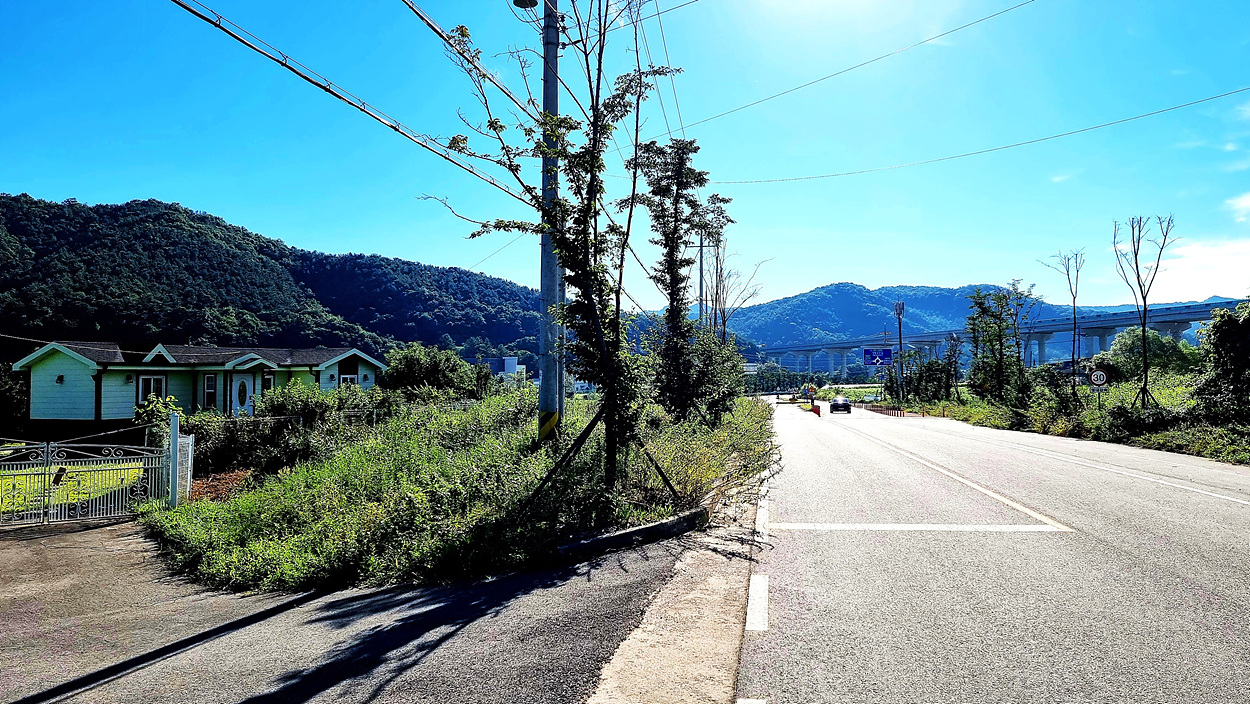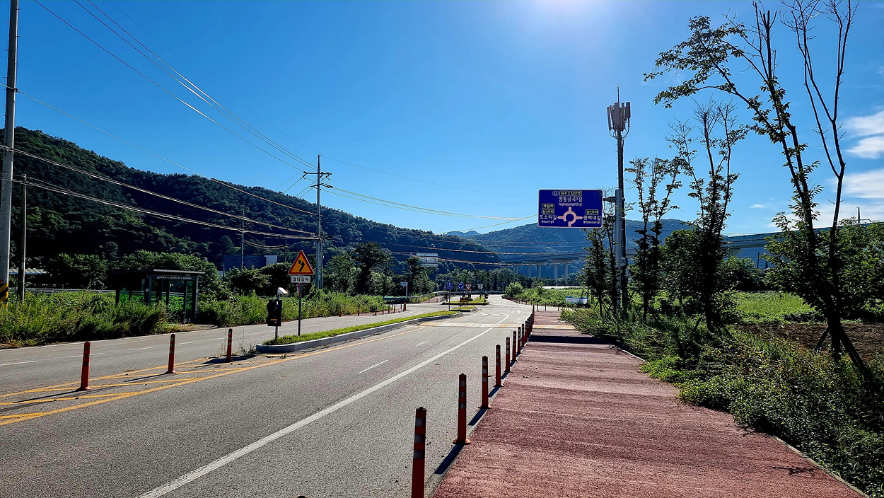 오른 쪽은 삼산2리 윗배내길로 갈라지는 원형로터리이며 삼산3리 버스정류장도 있다,