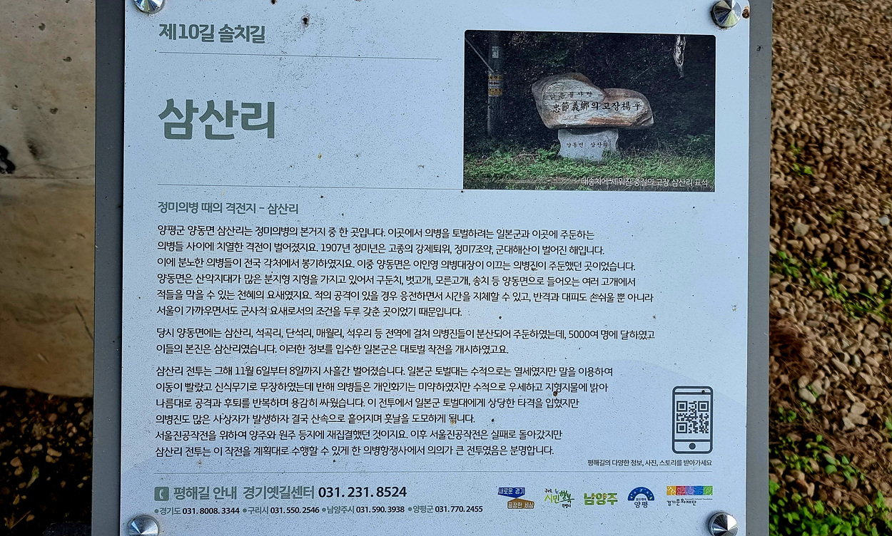 중앙선철도 아래는 삼산2리 주민들 쉼터로 이용되고 있었다, 이곳에는 제10길 솔치길 삼산리 안내가 있는데 살펴보니 정미의병때의 격전지인 양동면 삼산리는 정미의병의 본거지다, 라고 시작을 한다,