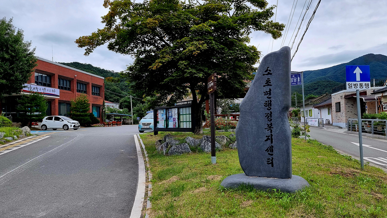 소초면행정복지센터 표지석이 세워저 있다,