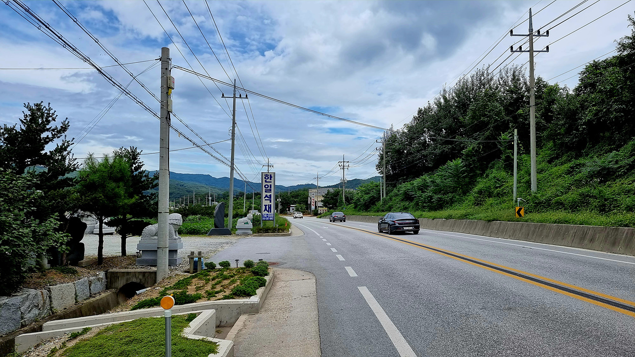 식송버스정류장에서 정확히 400m 지점에있는 한일석재를 지나서