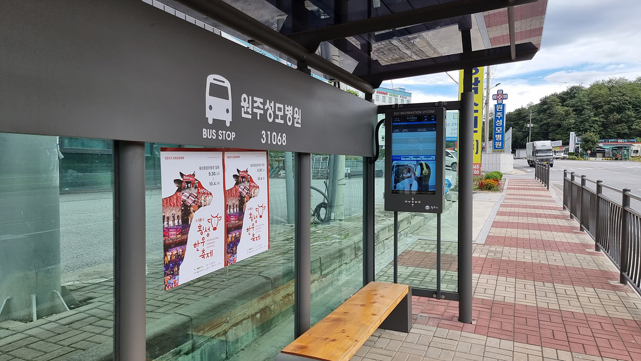 여기만 구식 버스정류장이다, 그래도 버스도착 시간을 알려주는 전광판도 설치되여 있다,