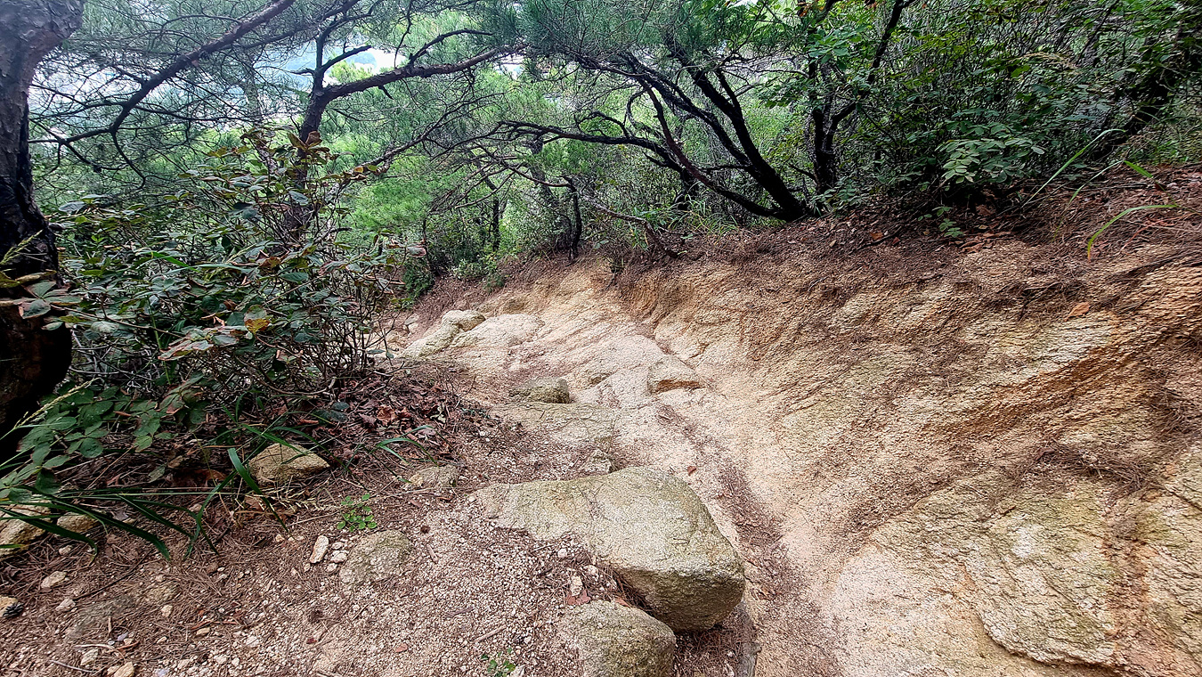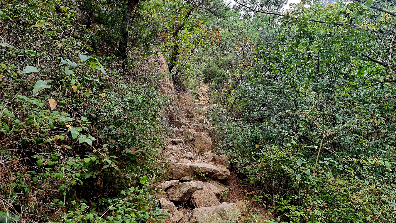 너덜길에 가파르고 미끄럽기도 한 거친 길이라서 조심해서 내려가야 한다,