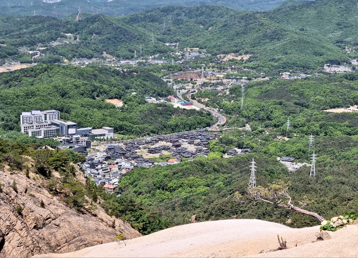 오늘 하산 지점인 하나고등학교(왼쪽 큰 건물)와 은평 한옥마을도 내려다 보인다,