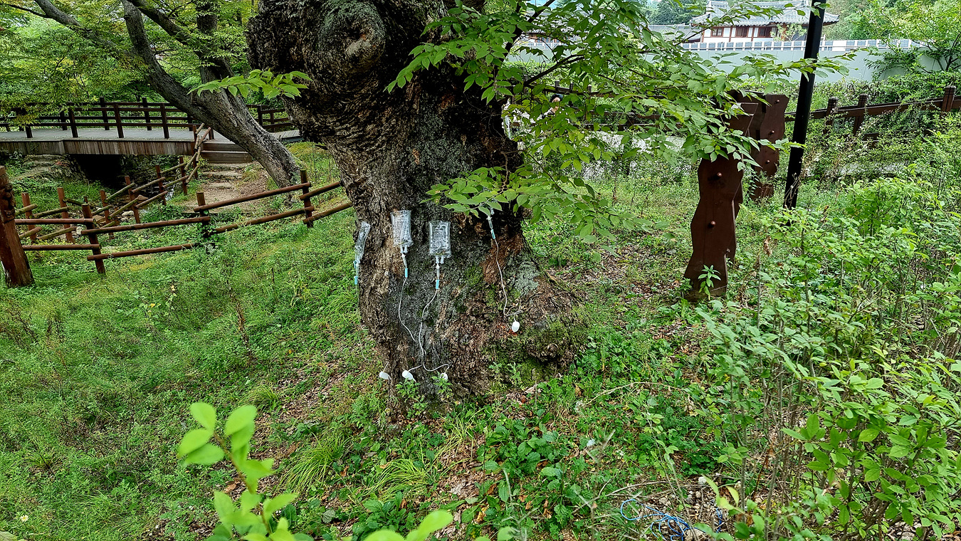 200살이나 되였다는 느티나무는 링거주사를 맞고 있다