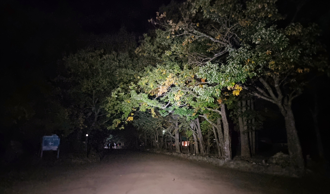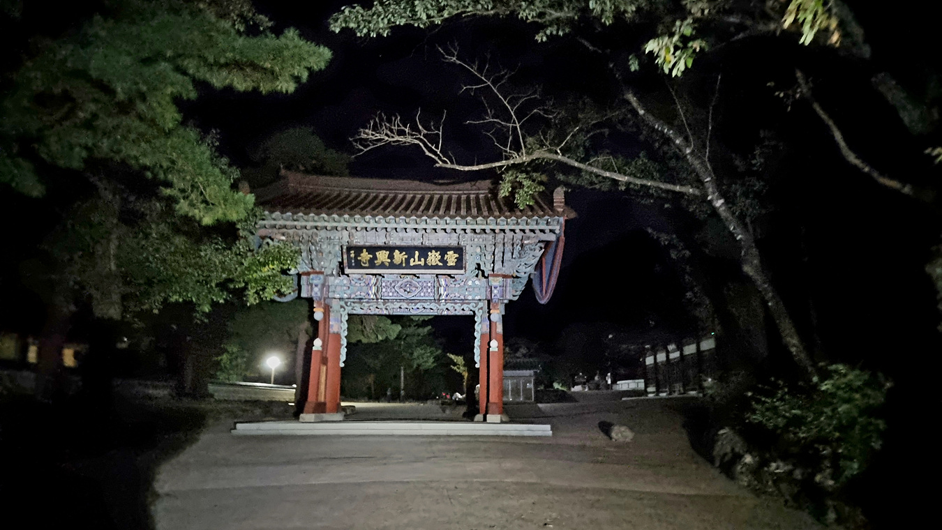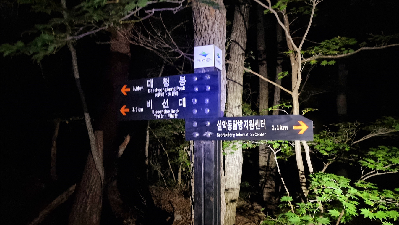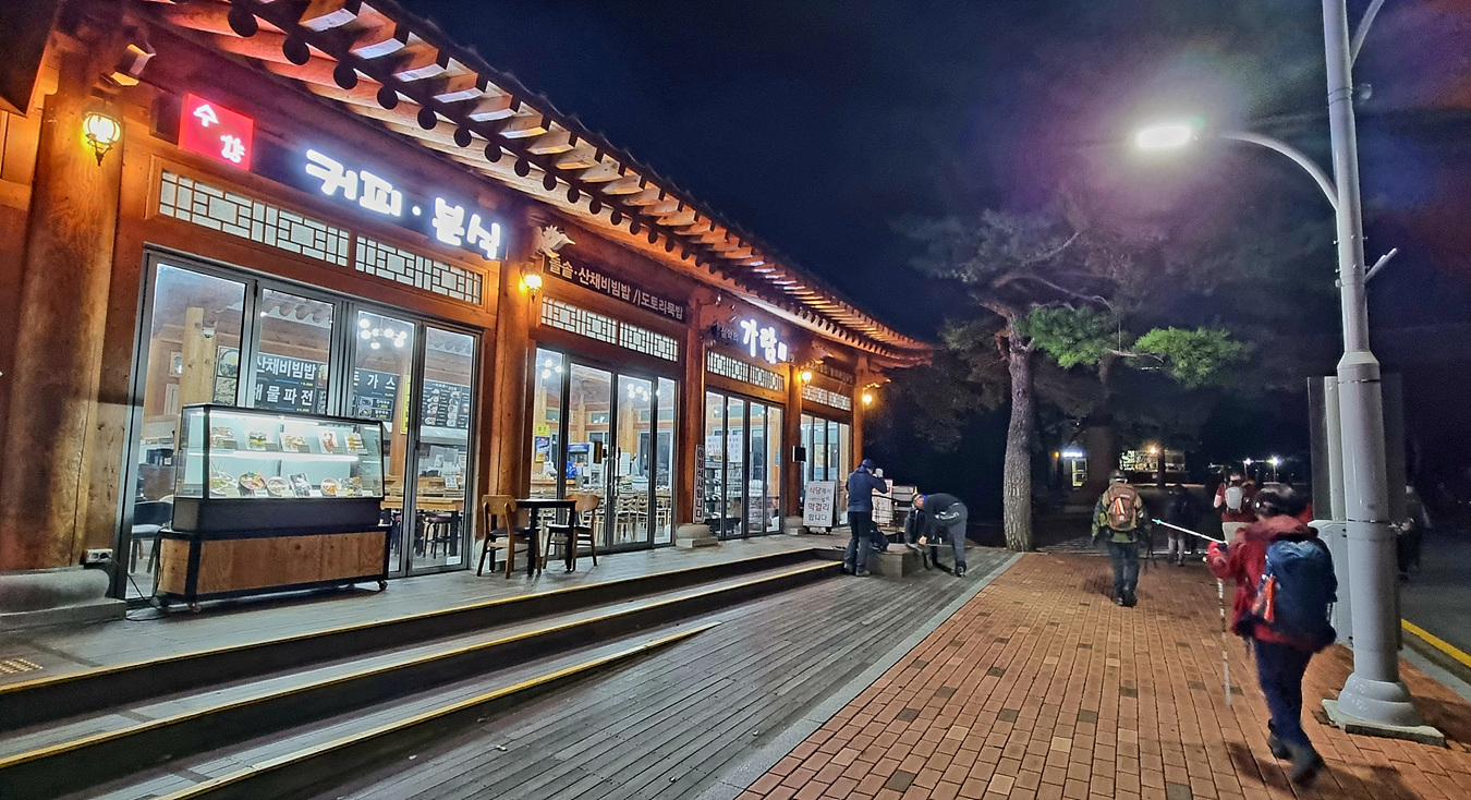 2022년 10월 14일 23:00 동서울 터미널에서 속초 가는 심야 우등버스를 타고 정확히 2시간 걸려 속초버스터미널에 도착해 택시로 설악산 신흥사로 이동했다, 신흥사 도착시간 02시, 신흥사입구 상가 식당들은 대낮처름 불을켜고 성업중이다,
