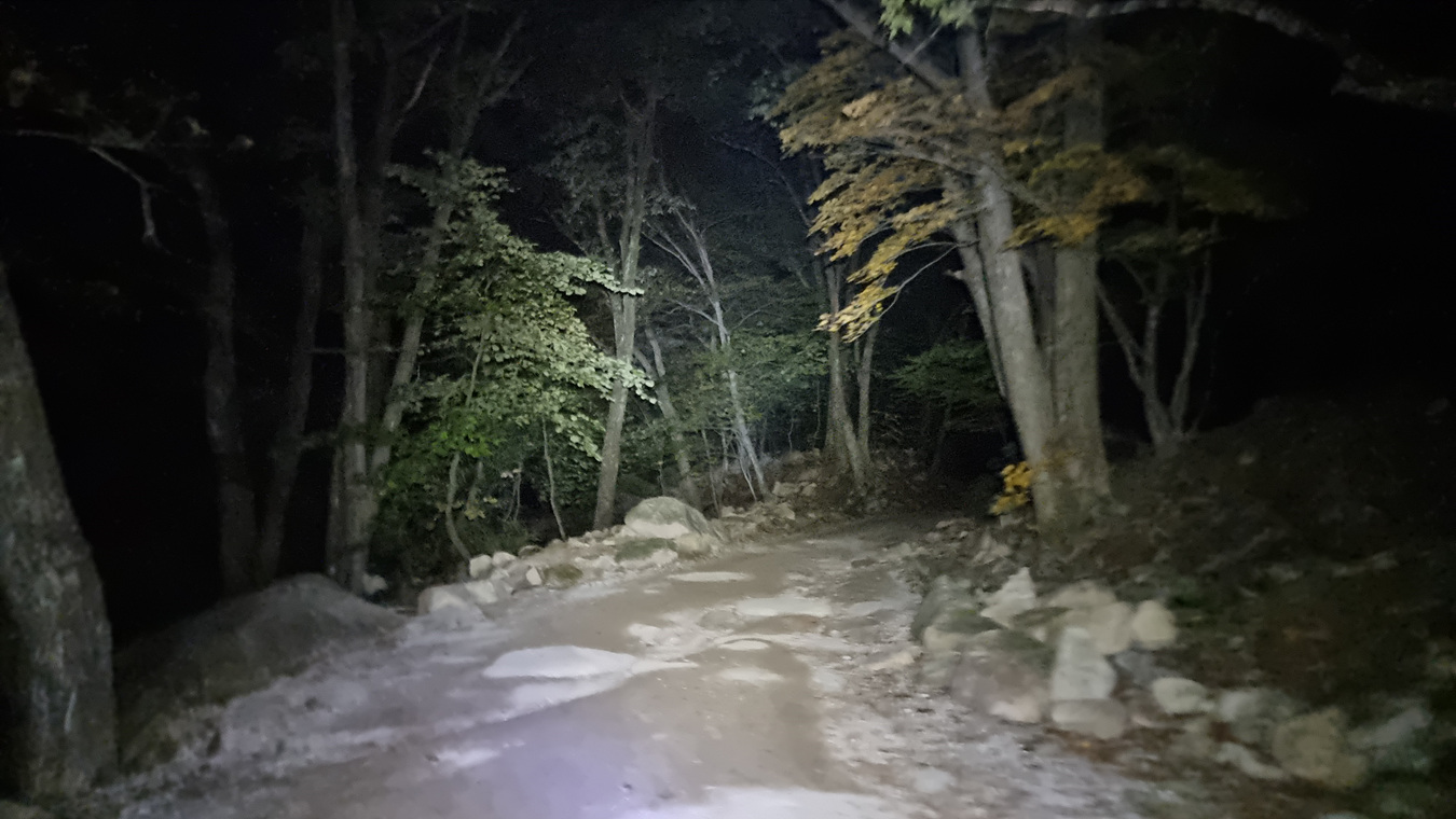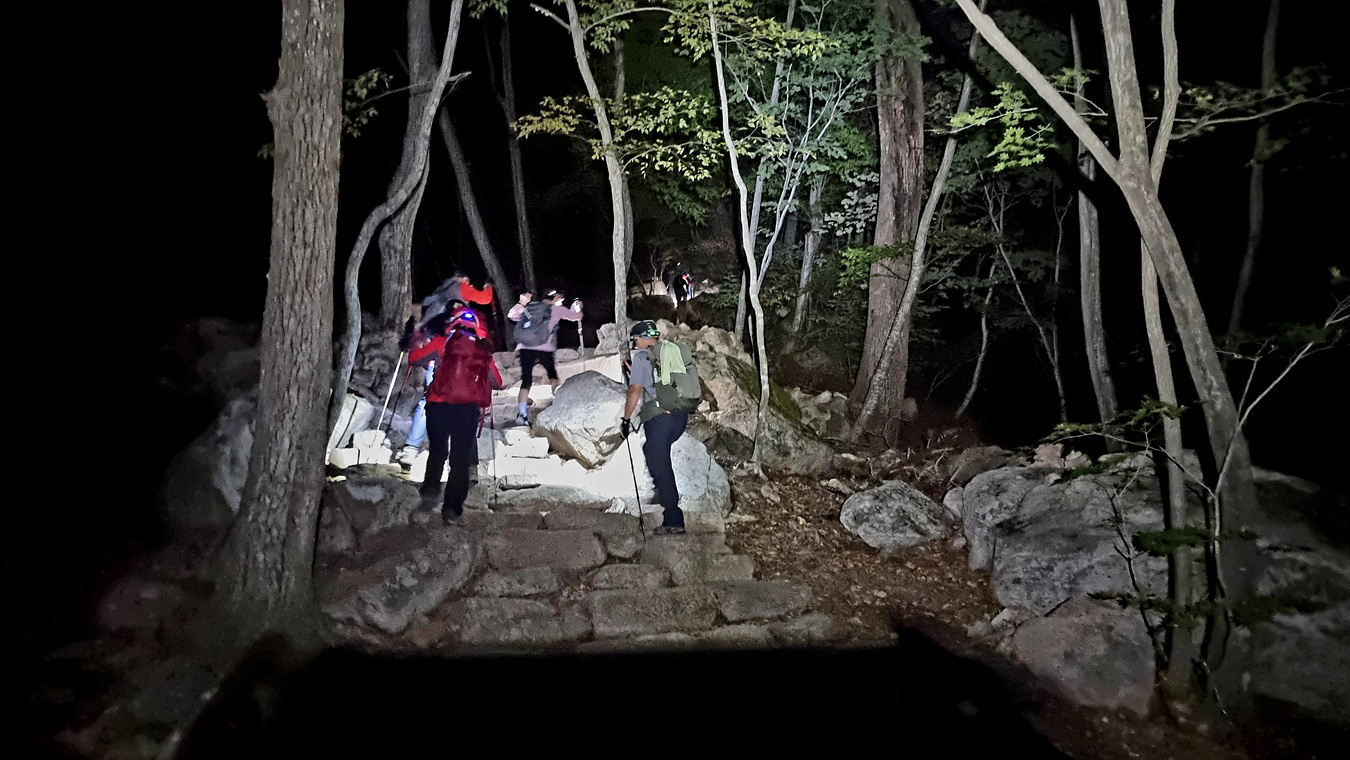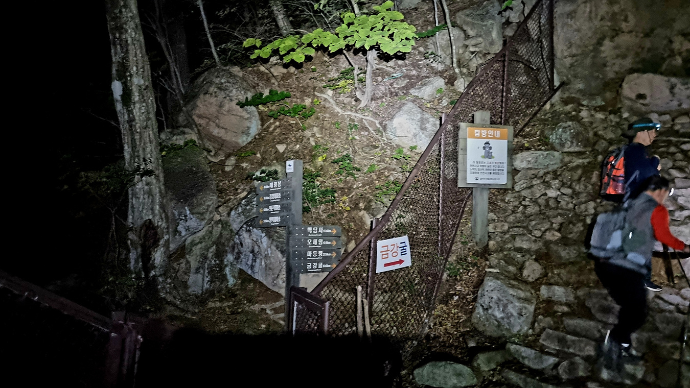 이 길은 비선대에서 올려다 보이는(밤이라 보이지는 않지만)세 암봉 중 장군봉을 우회하는 길인데