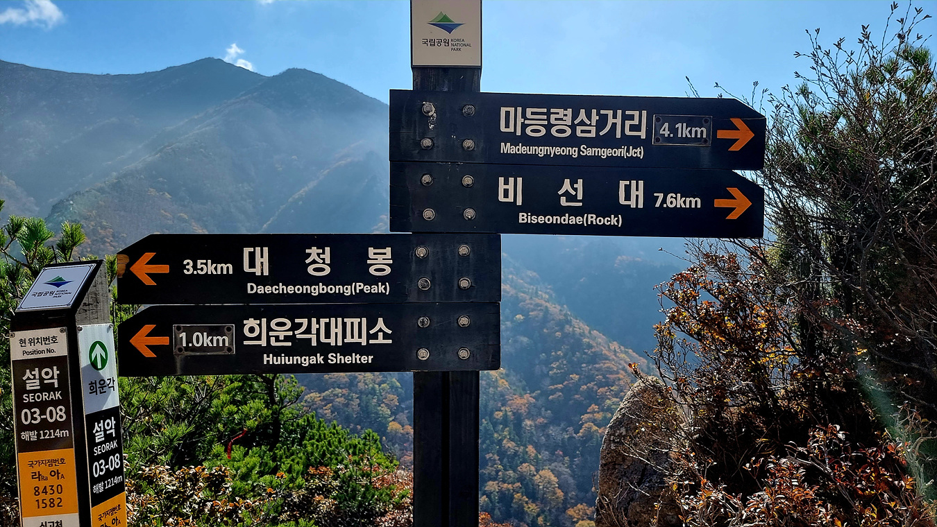 이정표가 있는 곳이 나오는데 여기가 무너미고개다, 여기서 직진은 희운각이고 좌측으로 내려가는 길은 천불동 계곡이다, 이제 공룡능선은 여기서 끝이다,