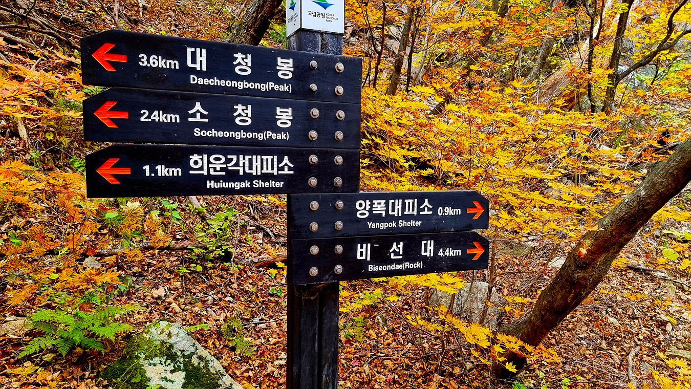 무너미고개에서 900m를 내려 온 지점에 이정표가 있는데 아직도 비선대는 4,4km거리다,