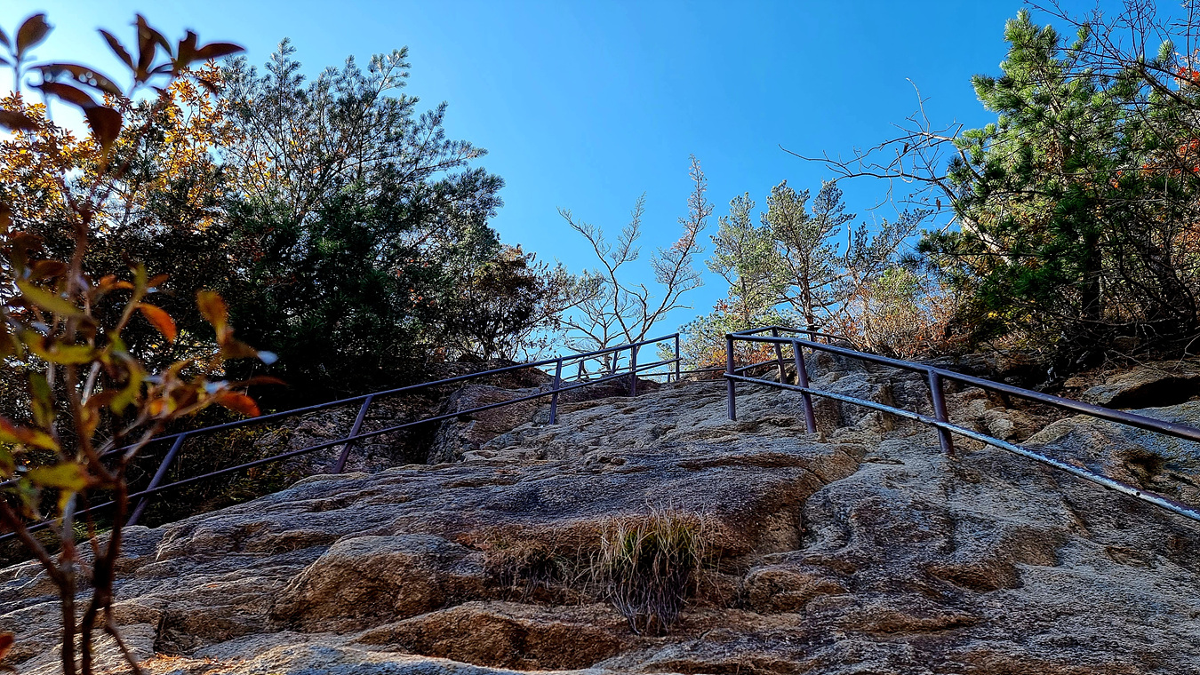쇠줄을 잡고 내려 가야 하는 암릉이 있고, 이 암릉을 내려가서 조금만 더 가면
