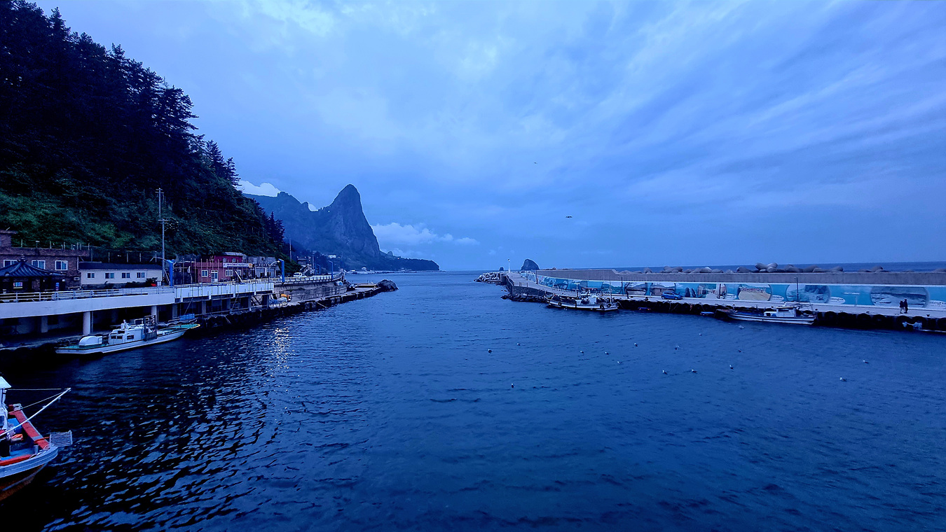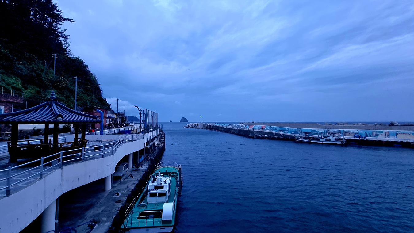 울릉도 들어간 다음날 새벽 싸늘한 아침 공기를 맞어면서 도로를 따라 천부항 일대와 축항 방파제 산책을 한다, 여기는 우리숙소 앞 울릉군 북면 천부버스종점이다,