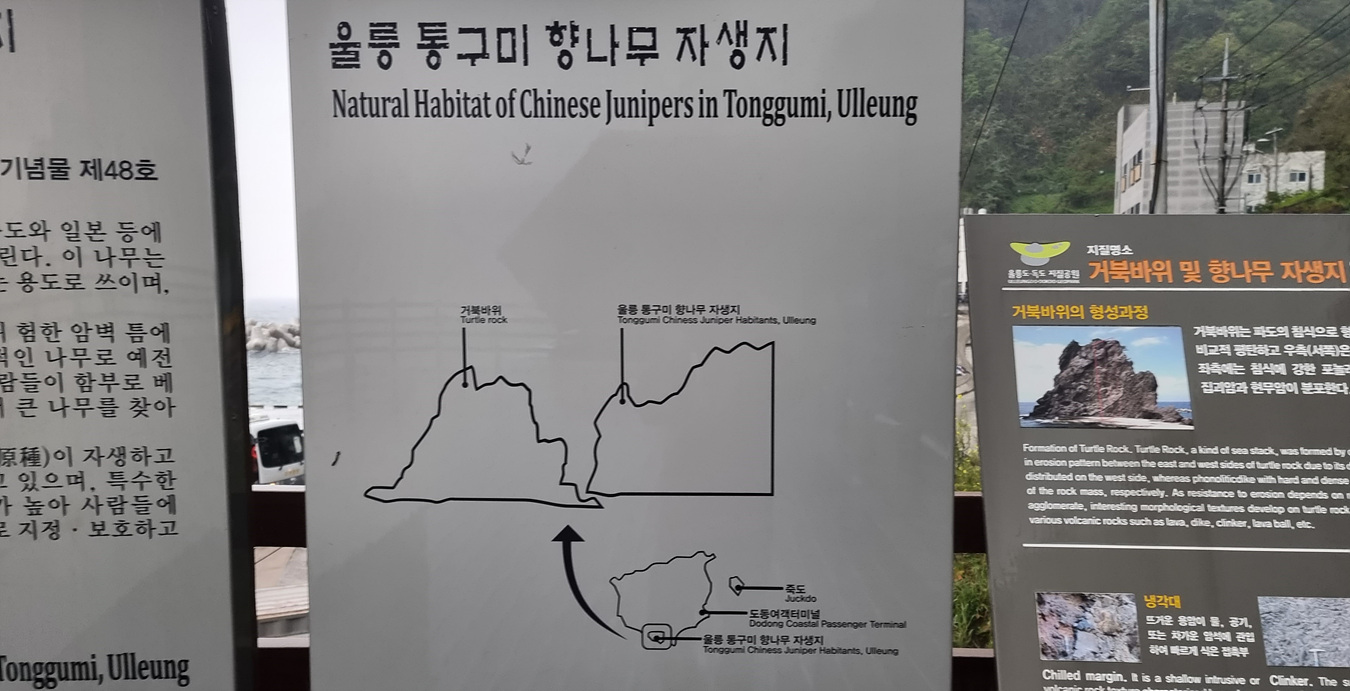 그리고 설명에는 향나무는 울릉도의 대표적인 나무로 예전에는 크고 오래된 나무가 많이 있었어나 사람들이 함부로 베어가서 통구미 자생지는 물론 섬 전체에서 큰 나무를 찾아 보기 어렵다고 했다,