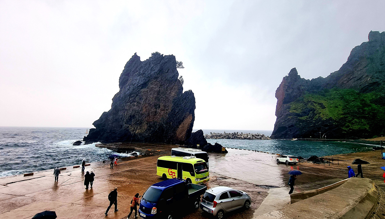 통구미 거북바위 앞 전망대 에서 비를 맞어며 함께 온 일행들과 울릉도 첫 기념 사진도 한장 찍었다, 1명은 찍사고 두명은 또 어딘가로 샛다, 단체는 꼭 이렇게 한 두사람이 빠지는게 자연스러운 모양이다,