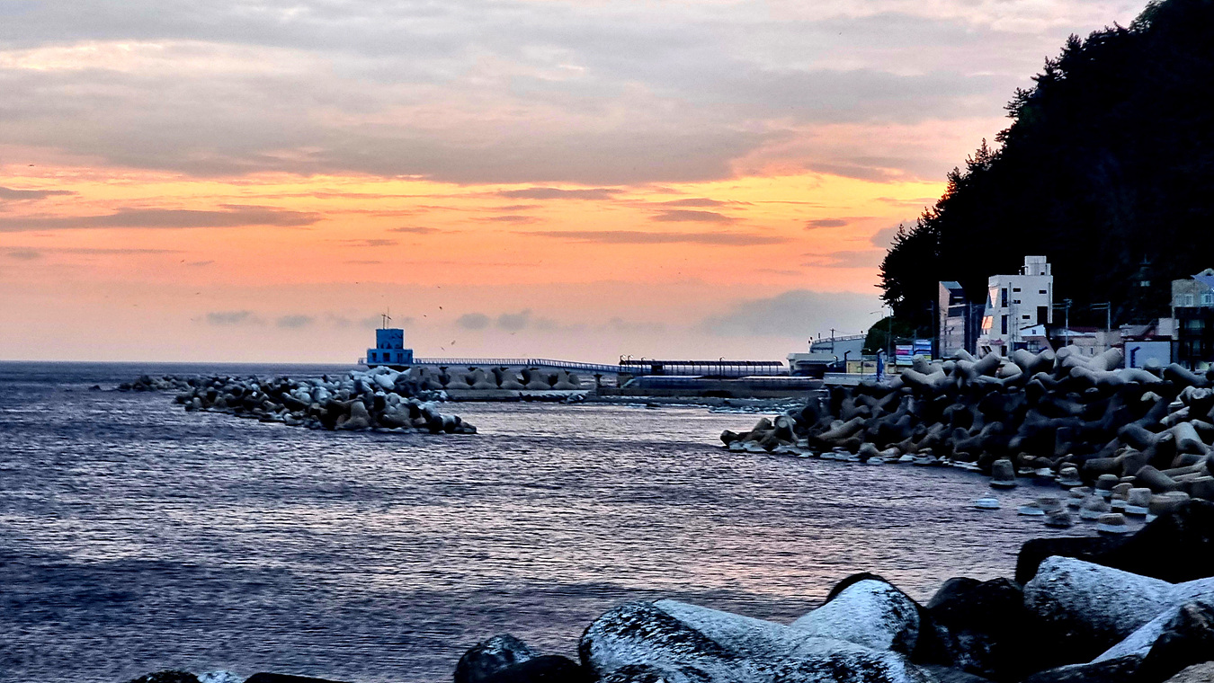 여기는 울릉도 북쪽이니 반대 방향에서 해가 뜨는 모양이다, 울릉도가 동해 바다에 있는 섬이니 어디서나 해가 뜨는줄 알았더니 섬에도 동서남북이 분명한가 보다, ㅎ 보이는 마을은 울릉도 북쪽에서는 제일 큰 마을인 울릉군 북면 천부리다,