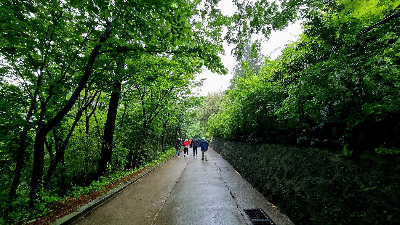 폭포를 보고나서 다시 삼나무 숲을 지나 내려간다,