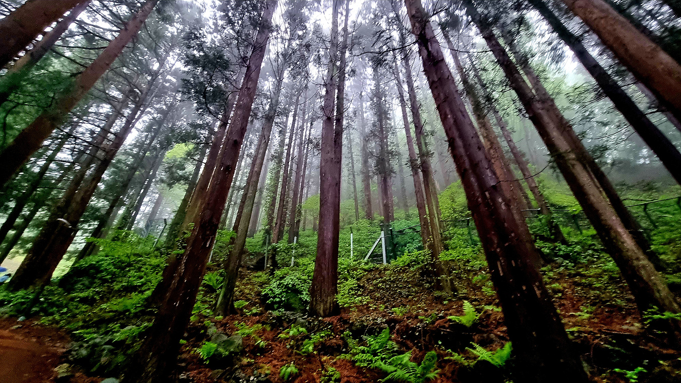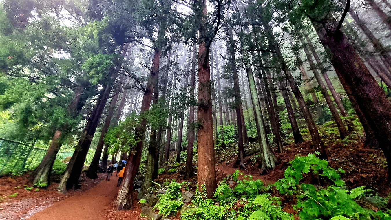 삼나무 숲을 지나서도 하늘까지 가리는 빼곡한 숲 길을 지나