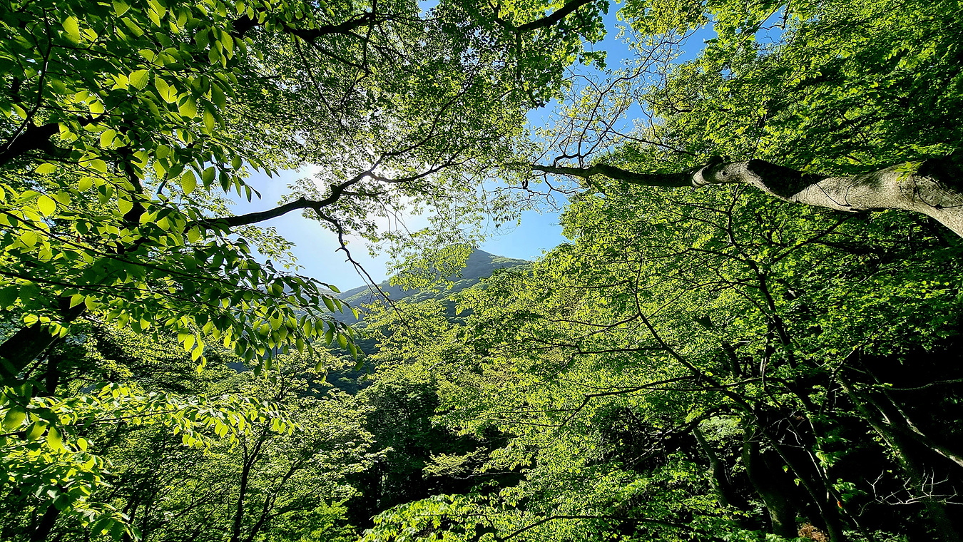 연록의 색이 녹색으로 바뀌는 아름다움 사이로 성인봉이 올려다 보인다,