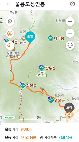 2023년 4월 30날 울릉도 나리분지에서 출발해 성인봉으로 올랐다가 KBS중계소 입구로 내려온 거리는 9km 이고 소요 시간은 4시간 10분이 걸렸어니 1시간에 산길 2km를 걸었다