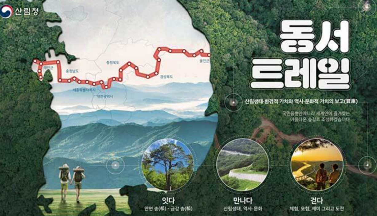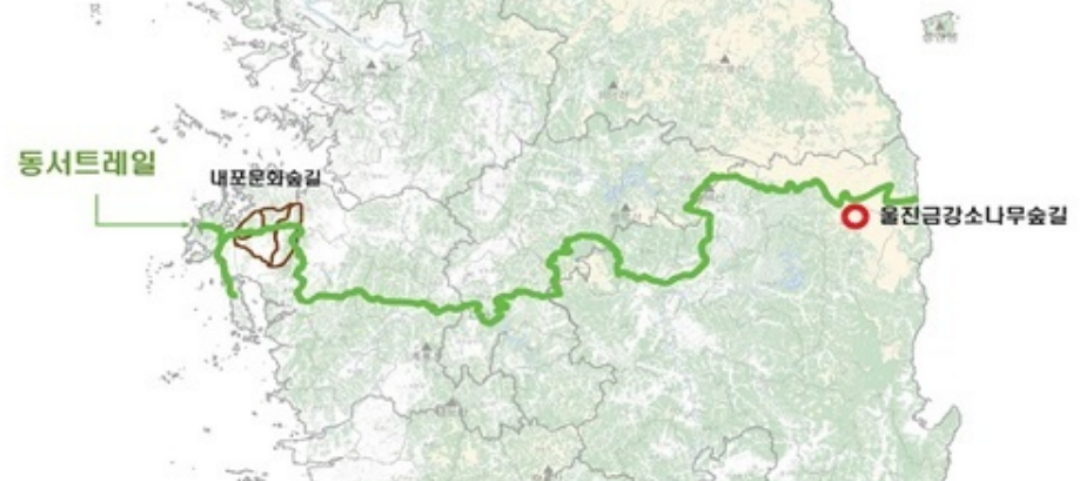 동서트레일은 경북 울진군 금강소나무림에서 충북, 대전, 세종, 충남 태안군 안면소나무림까지 5개의 시 도 849km 구간을 숲 길로 연결하는 사업이다. 총사업비는 604억원으로 2026년까지 전 구간을 개통할 동서트레일은 산림청과 5개 시 도 등이 공동으로 추진해 남쪽의 중간지점에서 동서를 연결하는 첫 숲길로 조성된다,