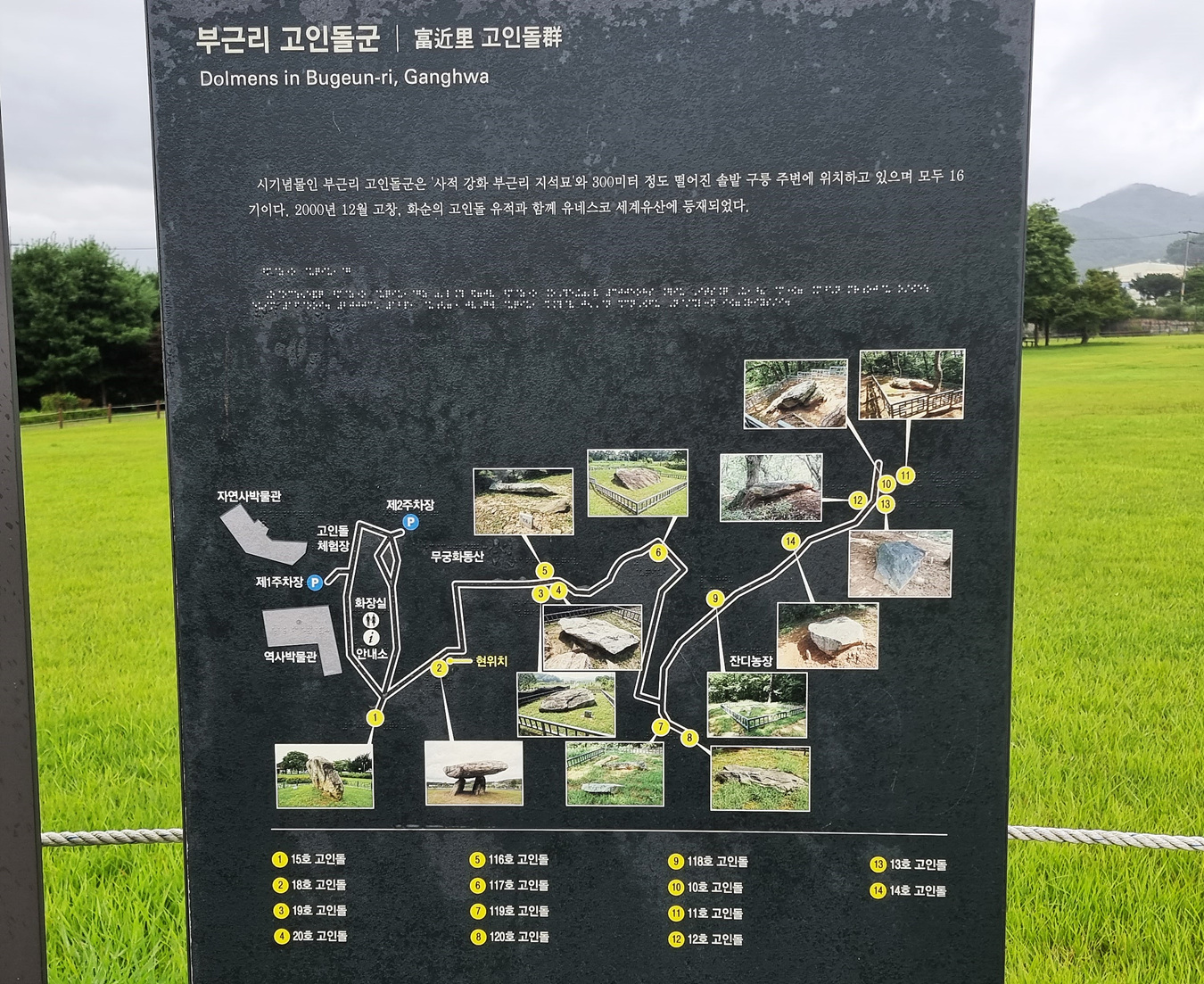세계문화 및 자연유산 보호에 관한 협약에 따라 세계유산위원회는 고창, 화순, 강화 고인돌 유적지를 세계문화유산 일람표에 동록한다, 는 내용의 세계문화유산 알림판도 있다,