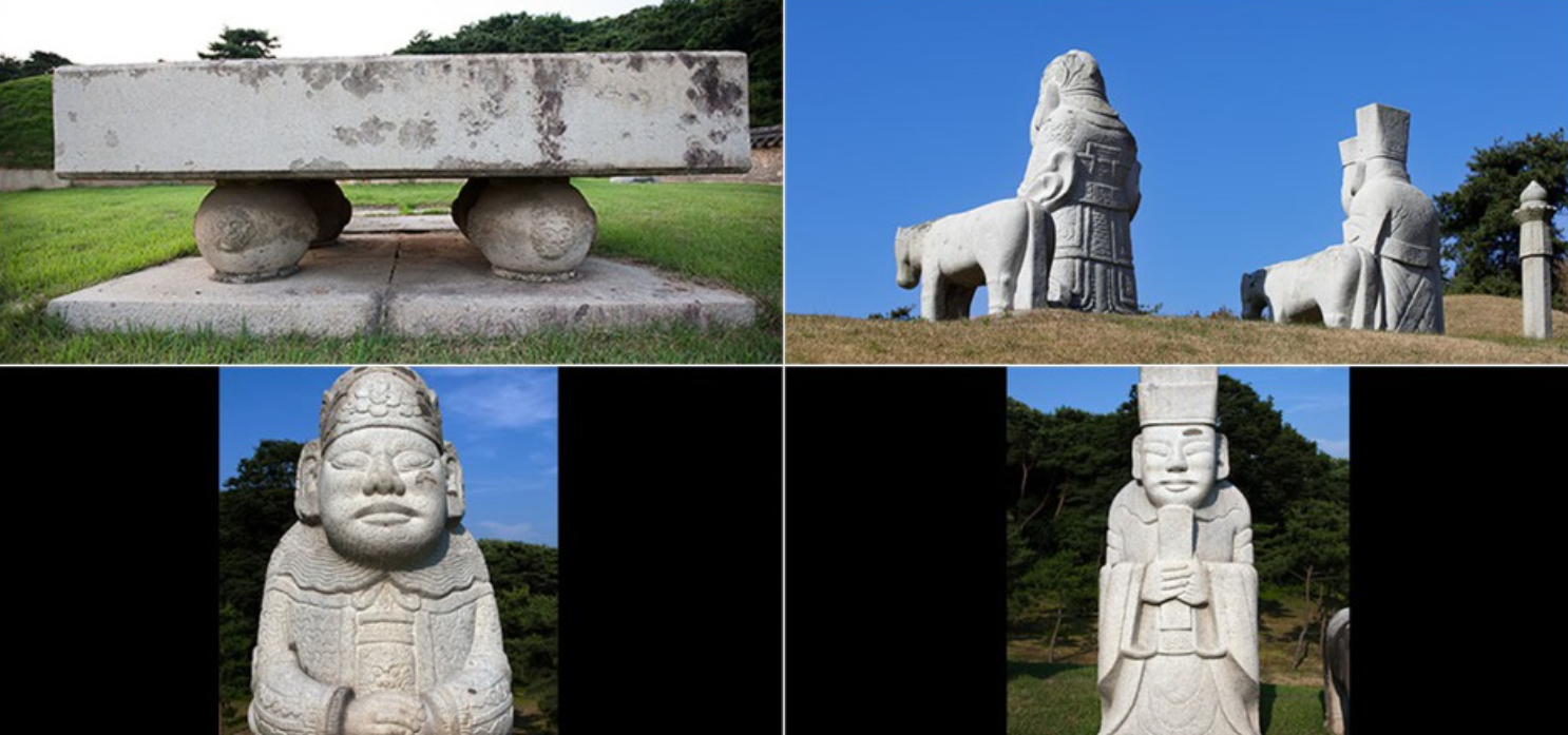 위↑에 보이는 혼유석과, 칼을 세워 짚은 무석인과 오른쪽 문석인, 아래↓사진의 석양과 석호 이며, 하단↓ 사진의 장명등과 망주석 등은 원종이 왕으로 추존된 이후에 새로 설치한 석물이다. 여기서 망주석 望柱石 이란 멀리서 보아도 능역임을 알리기 위해 능침 좌우에 세우는 돌 기둥이다,