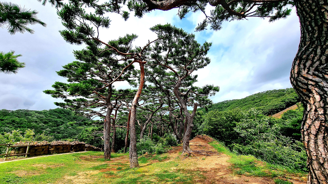 소나무 숲 사이로 동문 바깥 일대가 보인다,