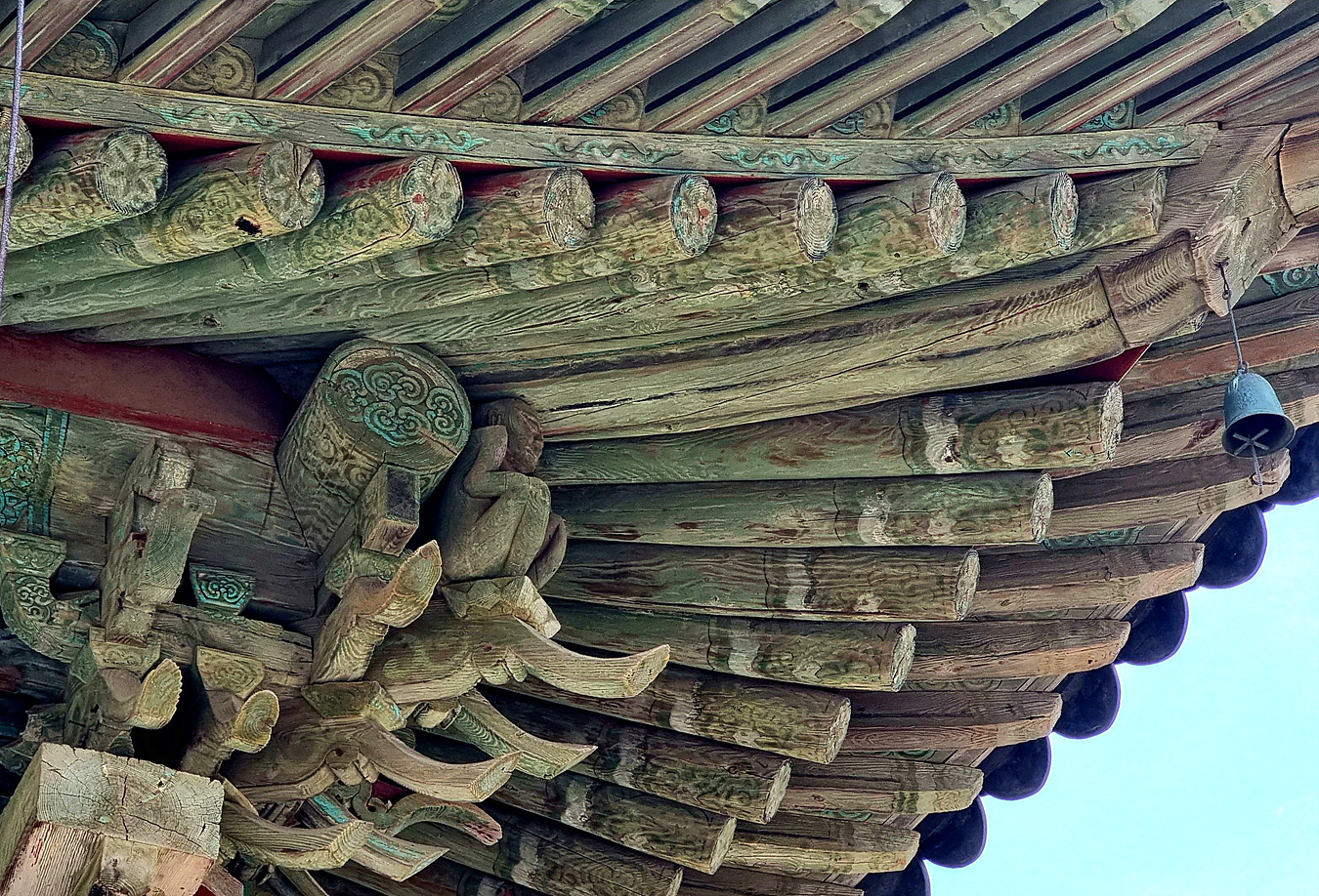 광해군 때 이 법당을 지었던 都片手 도편수 에게는 사랑하는 여인이 있었으나 그가 불사에만 전념하는 사이 다른 남자와 눈이 맞아 도망을 가버리자 도편수는 식음을 전폐하고 일을 하지 않다가 마음을 고쳐먹고 법당을 다시 짓기 시작했는데, 기둥 위에 여인의 나체상을 조각하여 수치심을 느끼게 하고, 또 머리 위에는 무거운 지붕을 얹어 고통을 줌으로써 자신을 배반한 여인에게 복수를 했다는 내용이다