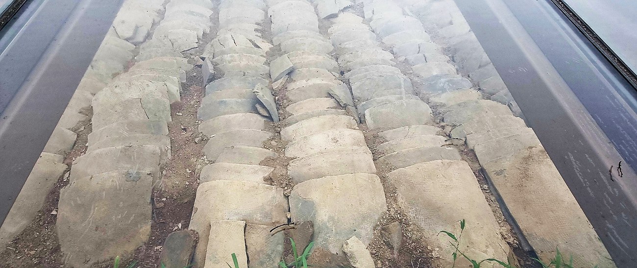 이렇게 보이는 기와유물은 행궁 건물지에서 발견된 신라시대 기와로 행궁이 들어서기 전에 시기는 알 수 없지만 이미 이곳에 건물이 있었던 터로 보인다,