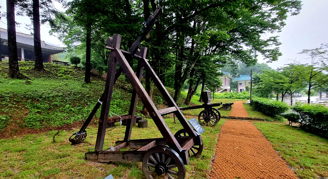지렛대의 힘을 이용하여 무거운 물체를 멀리 던지기 위한 도구다, 전시된 투석기는 전시용 모형이다,