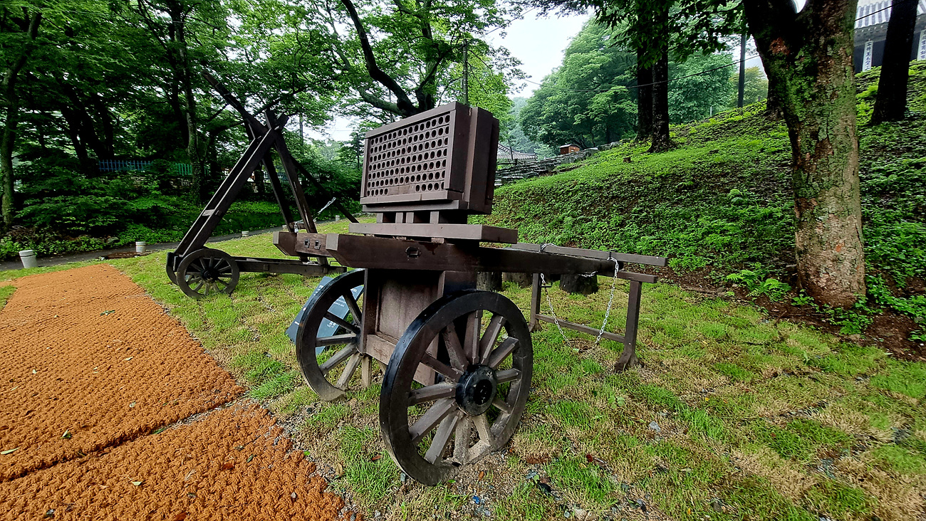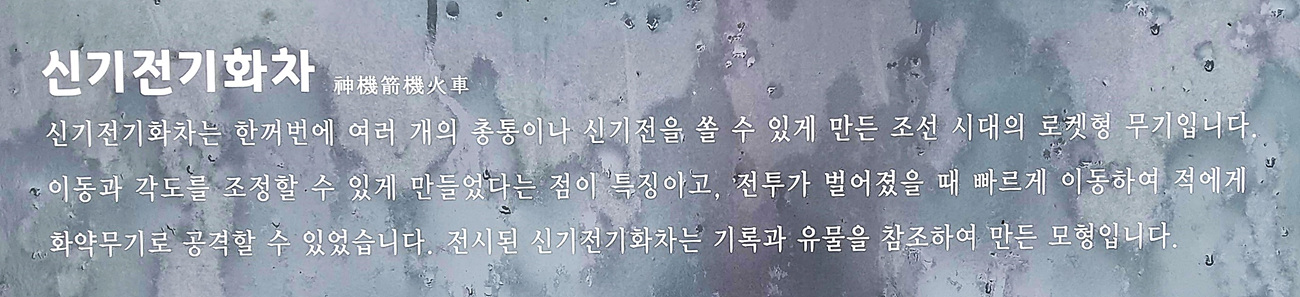 神機箭火車 신기전화차는 한꺼번에 여러개의 총통이나 신기전을 쏠 수 있게 만든 조선시대 로켓형 무기로 이동과 각도를 조정할 수 있게 만든 점이 특징이고