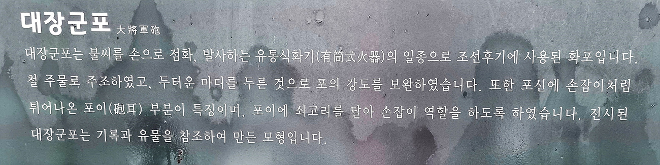 철 주물로 주조하였고, 두터운 마디를 두른것으로 포의 강도를 보완하였다, 또한 포산에 손잡이 처름 튀여 나온 砲耳 포이 부분이 특징이며 포이에 쇠고리를 달아 손잡이 역활을 하도록 했다, 전시된 대장군포는 기록과 유물울 참조하여 만든 모형이다,