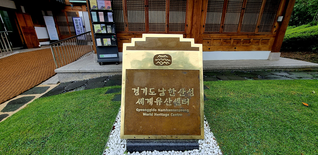 표지 동판으로 경기도 남한산성세계유산센터라는 안내가 있다, 행궁앞 회전로터리에서 약 500m정도의 거리다, 이곳 안내 부스에 비치되여 있는 문화유산 탐방 여귄에 스템프를 찍는다,