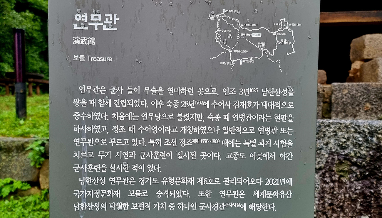 남한산성 연무관은 유형문화제 제6호로 관리되어오다 2021년에 국가지정문화재 보물로 승격되었다, 또한 연무관은 세계문화유산 남한산성의 탁월한 보편적 가치중 하나인 군사경관(군사 시설)에 해당한다,
