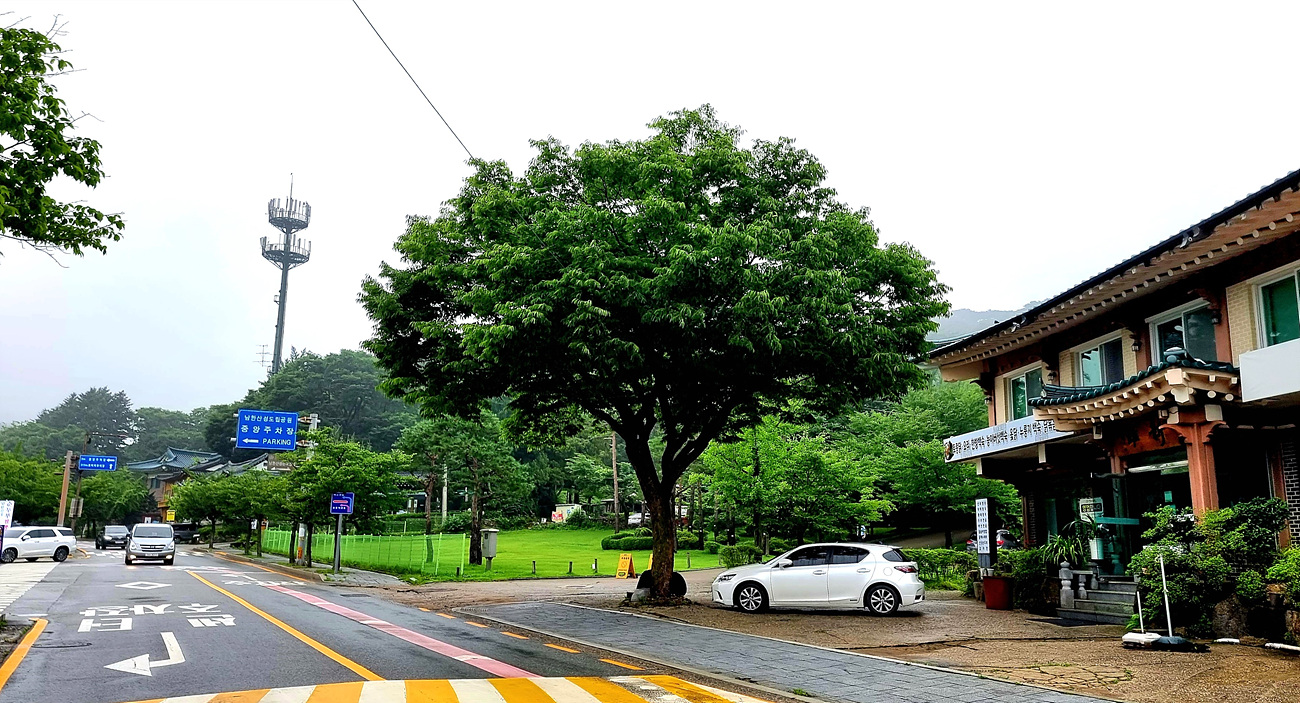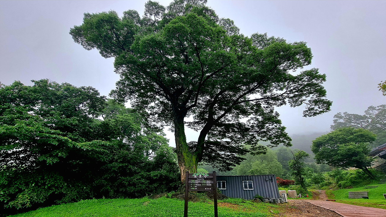 연무관에서 내려다 보이는 오른쪽에 고풍스러운 느티나무가 있는데 이 느티나무는 410년이나 된 나무다,