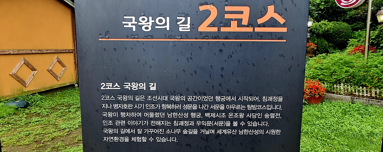 2코스는 국왕의 길로 행궁에서 시작하여 침괘정을 지나 병자호란시기 인조가 항복하러 성문을 나간 서문을 아우러는 탐방코스다,